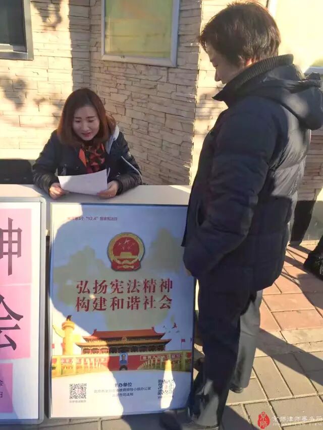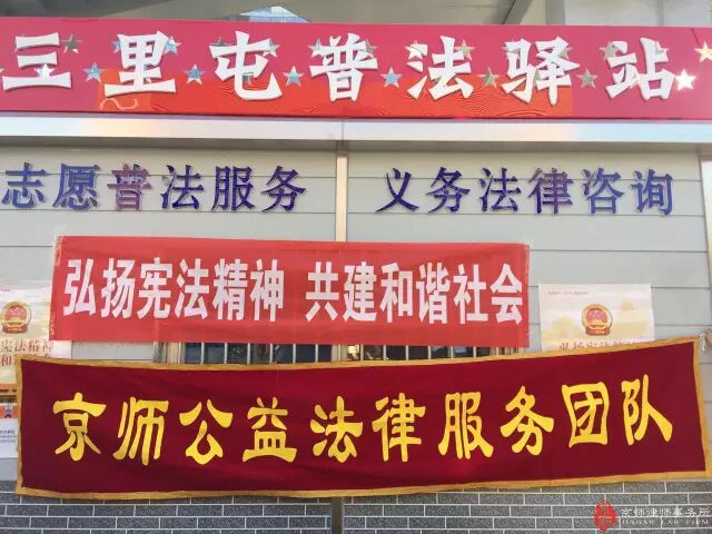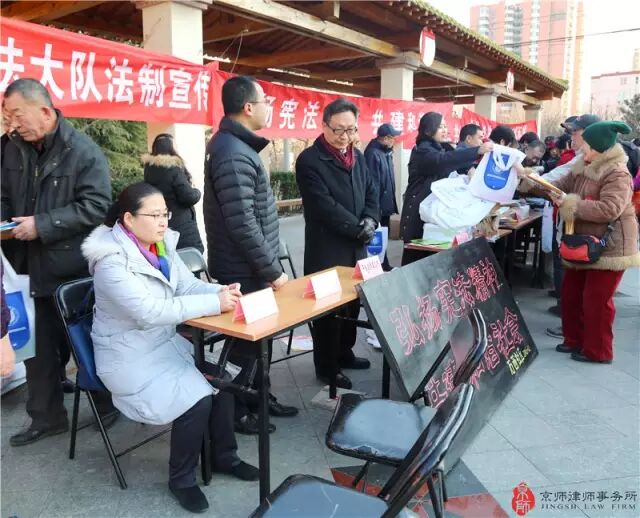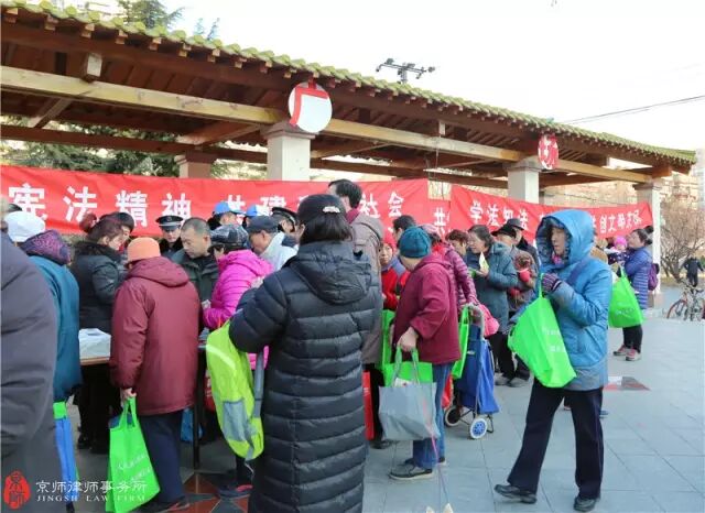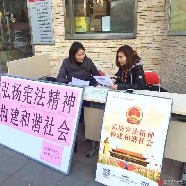 在第三个“国家宪法日”来临之际,2016年12月2日,北京市京师律师事务所公益法律服务与调解中心,积极为本所律师搭建法律服务平台,何永萍律师、许占波律师、李江华律师、徐鹏律师、王东红律师、王荣梅律师、丁香律师、顾晓明律师、毕文胜律师和公益部苏萍女士、白淑敏女士、王美东女士等人员分别在三里屯公益普法驿站、石佛营小区中心广场、朝外吉庆里展开了法制宣传工作和各种法律咨询服务,此次活动旨在营造全民学习宪法、宣传宪法、遵守宪法、维护宪法的良好氛围,为基层提供有力的法治保障。