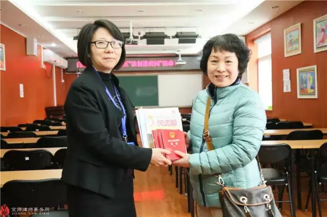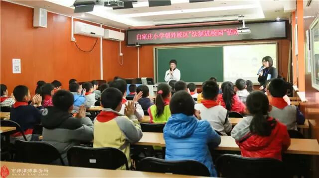 2016年3月17日15时,朝外街道办司法所所长张雷,白家庄小学朝外校区德育副主任郑琪,朝外吉庆里社区委员刘俊荣,京师公益法律服务与调解中心苏萍主任,京师律师事务所家事诉讼法律事务部主任王东红律师共同在白家庄小学朝外校区合班教室参与“法制进校园”活动。并由王东红律师作为主讲,带领小学生走进“女童保护”法制课堂。